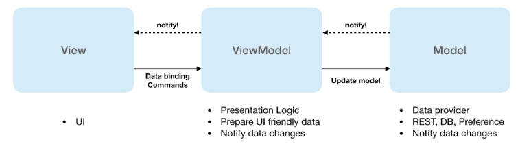 MVP패턴에서 Presenter와 View, 그리고 Model간의 의존성이 너무 깊은것 아닌가?에서 시작되어 진보된 패턴이다.